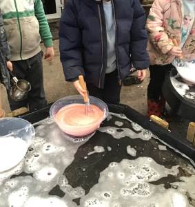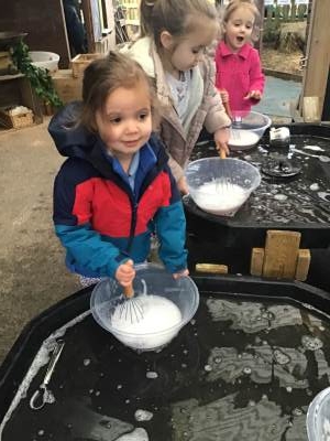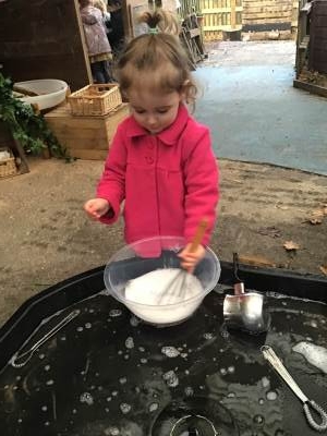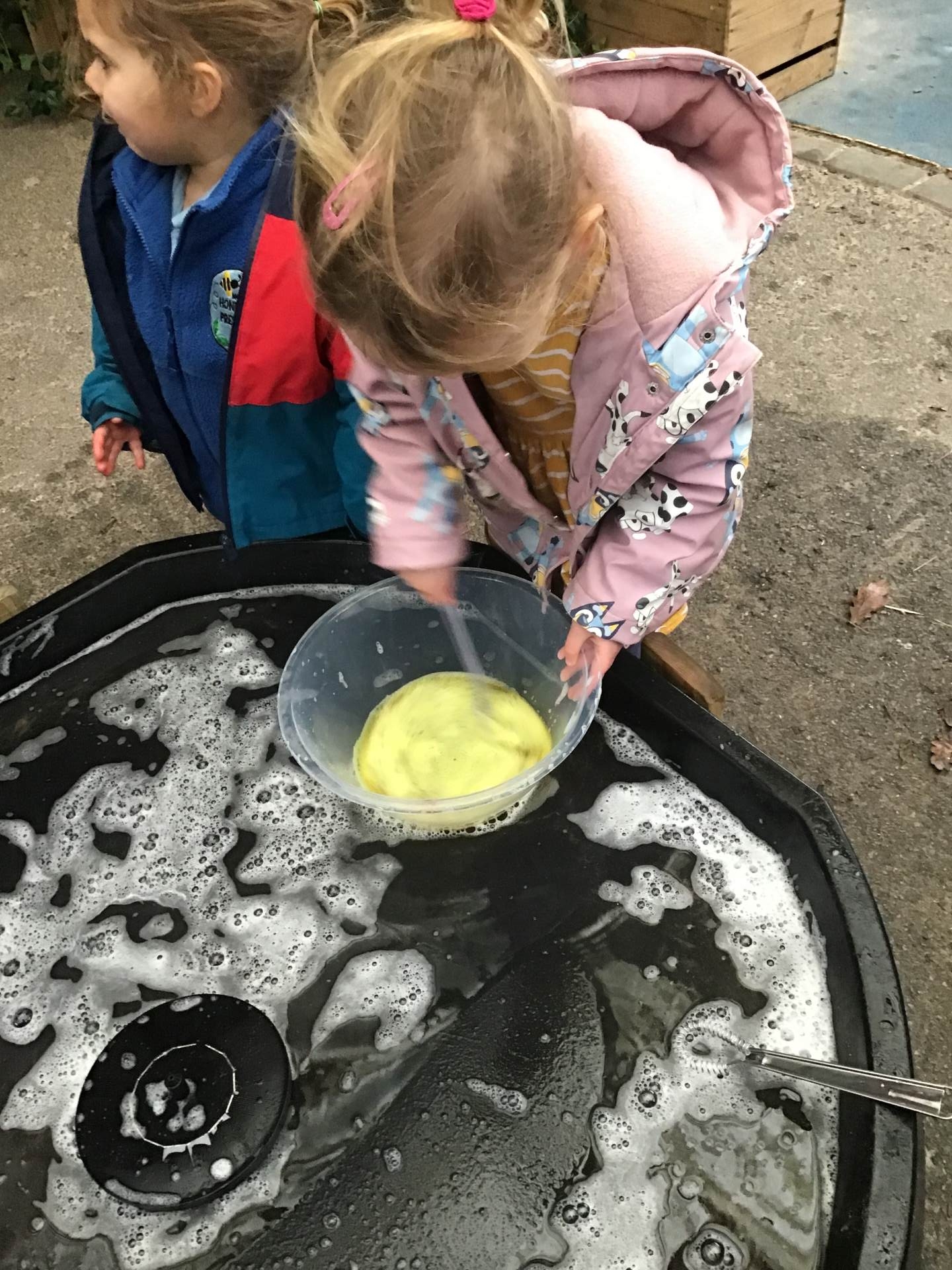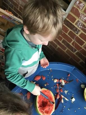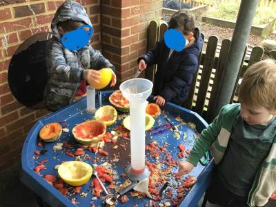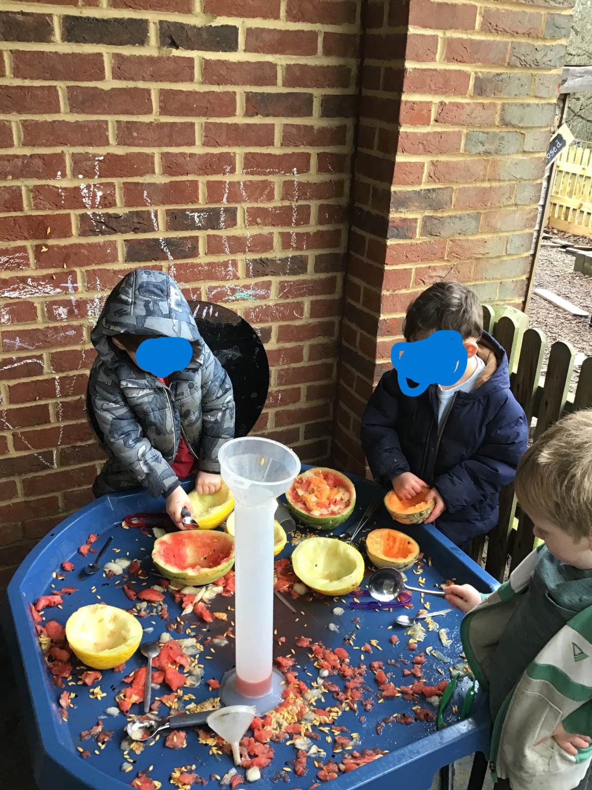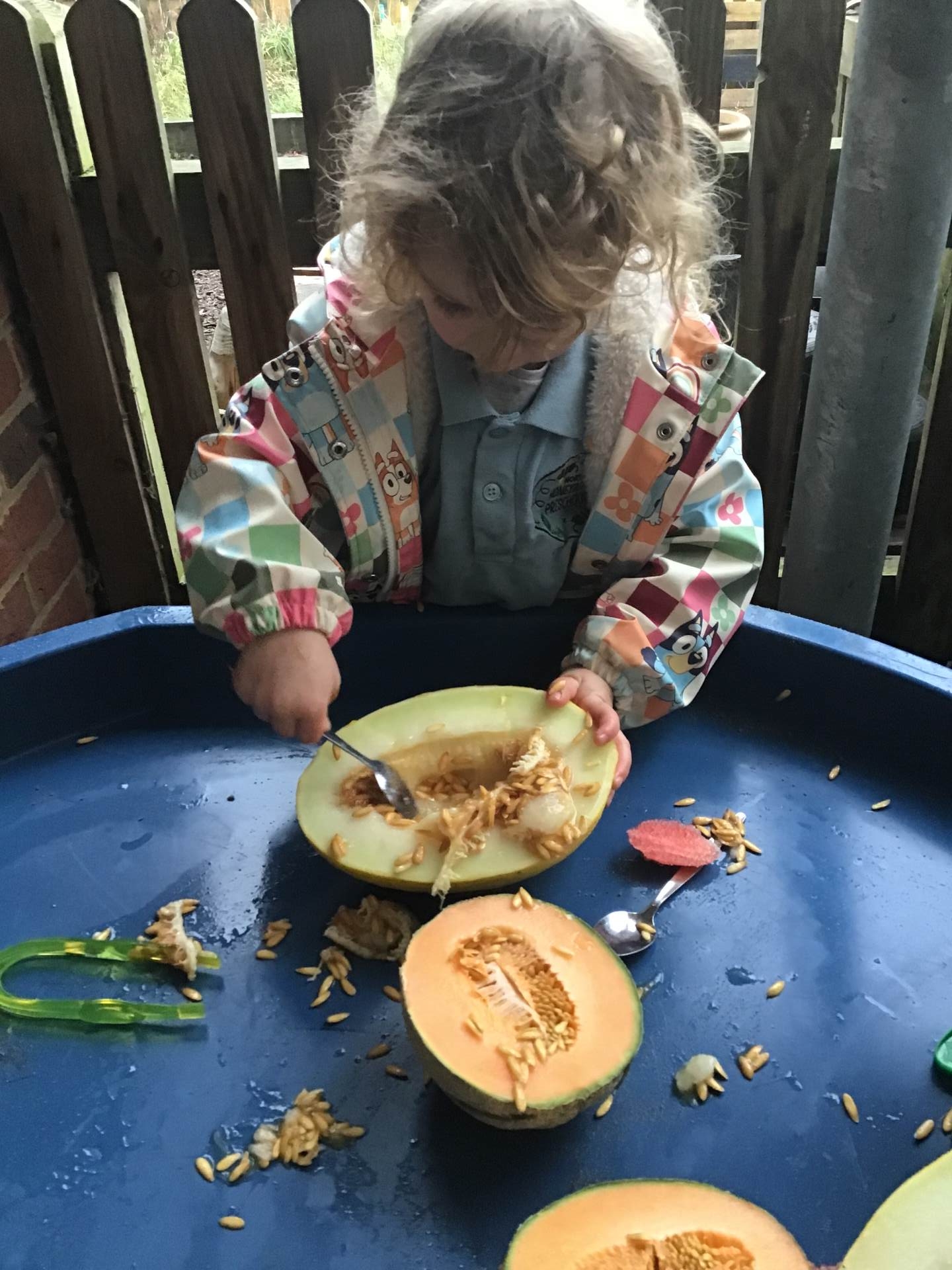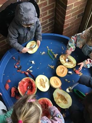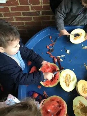 In our water play area, the children have been developing their gross motor skills and bilateral coordination by whipping up bubbles and colours, creating a mesmerizing display of texture and movement. But that's not all - our young scientists have also been scooping melons of different varieties to discover how each has a unique resistance when scooped. Using tweezers to pick out seeds and measuring the juice, they've been developing their fine motor skills and learning about the properties of different fruits.