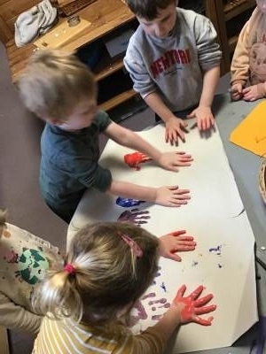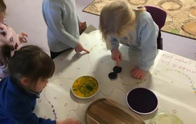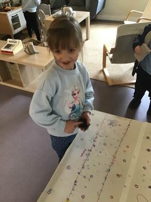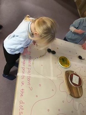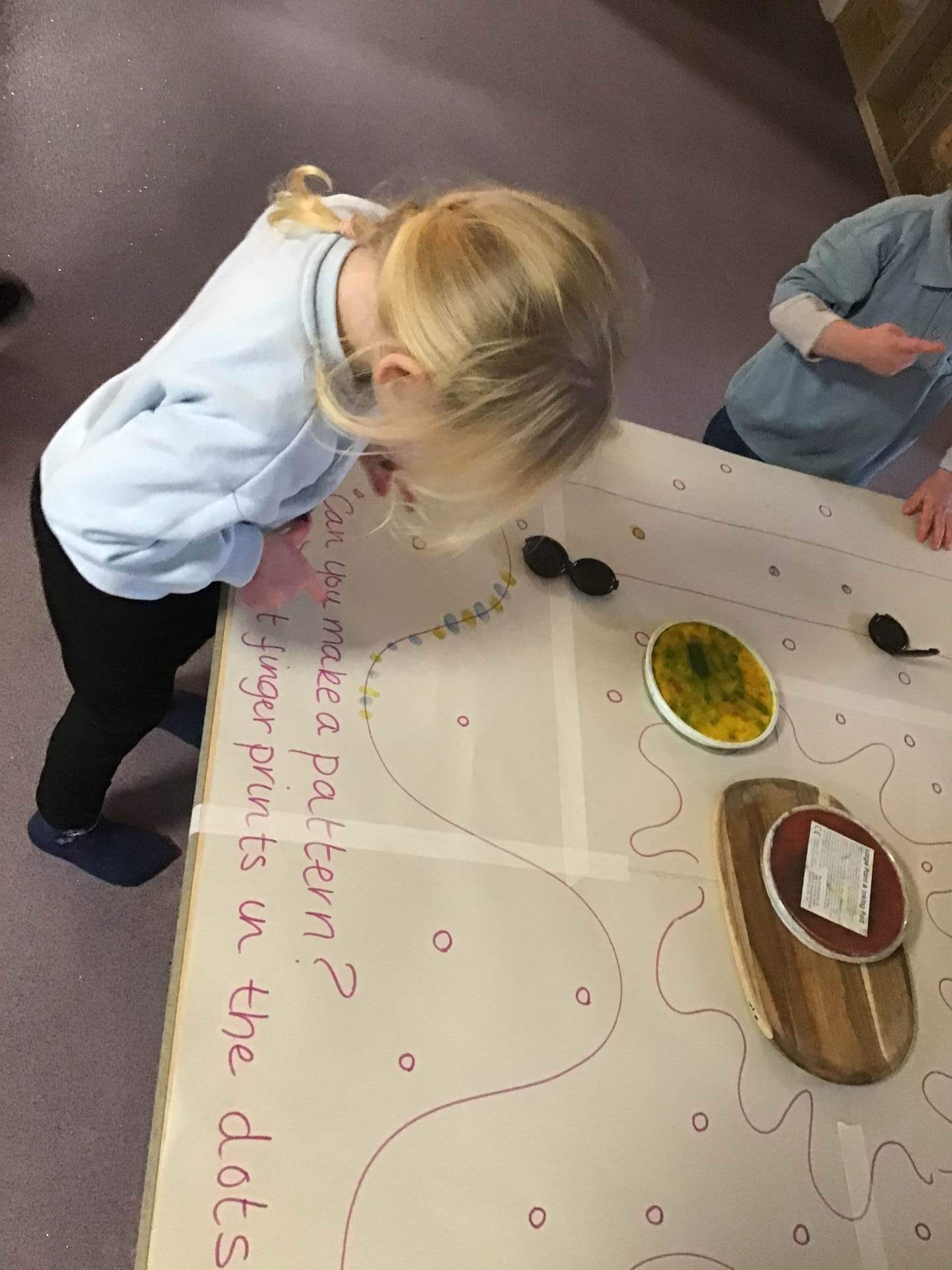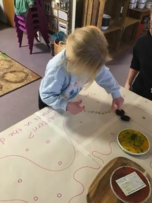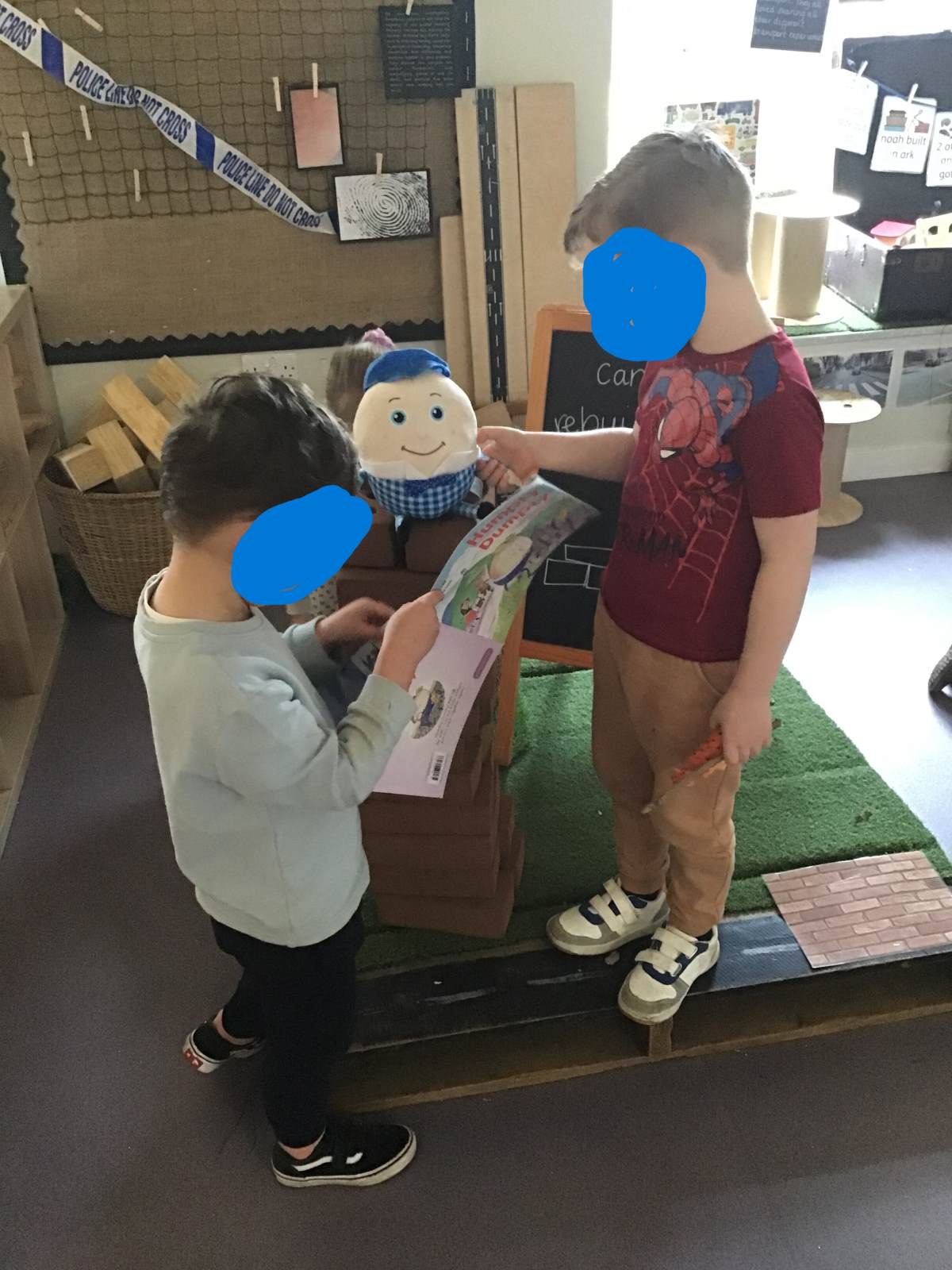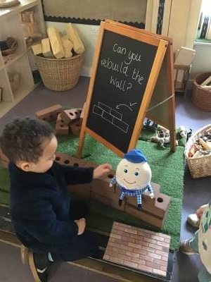 Meanwhile, in the construction zone, our builders have been hard at work rebuilding the wall for Humpty Dumpty. As they work together to create a sturdy structure, they're also investigating the mystery of who pushed Humpty Dumpty off the wall. Using finger painting to create simple patterns, they're refining their understanding of pattern creation and developing their accuracy skills.