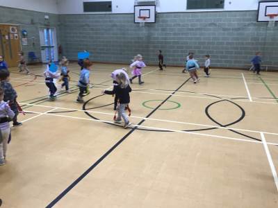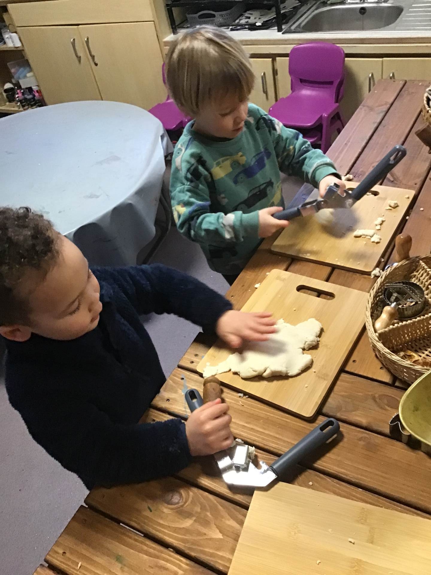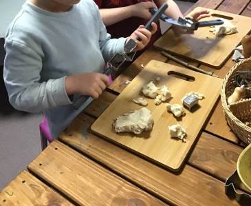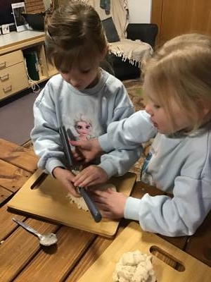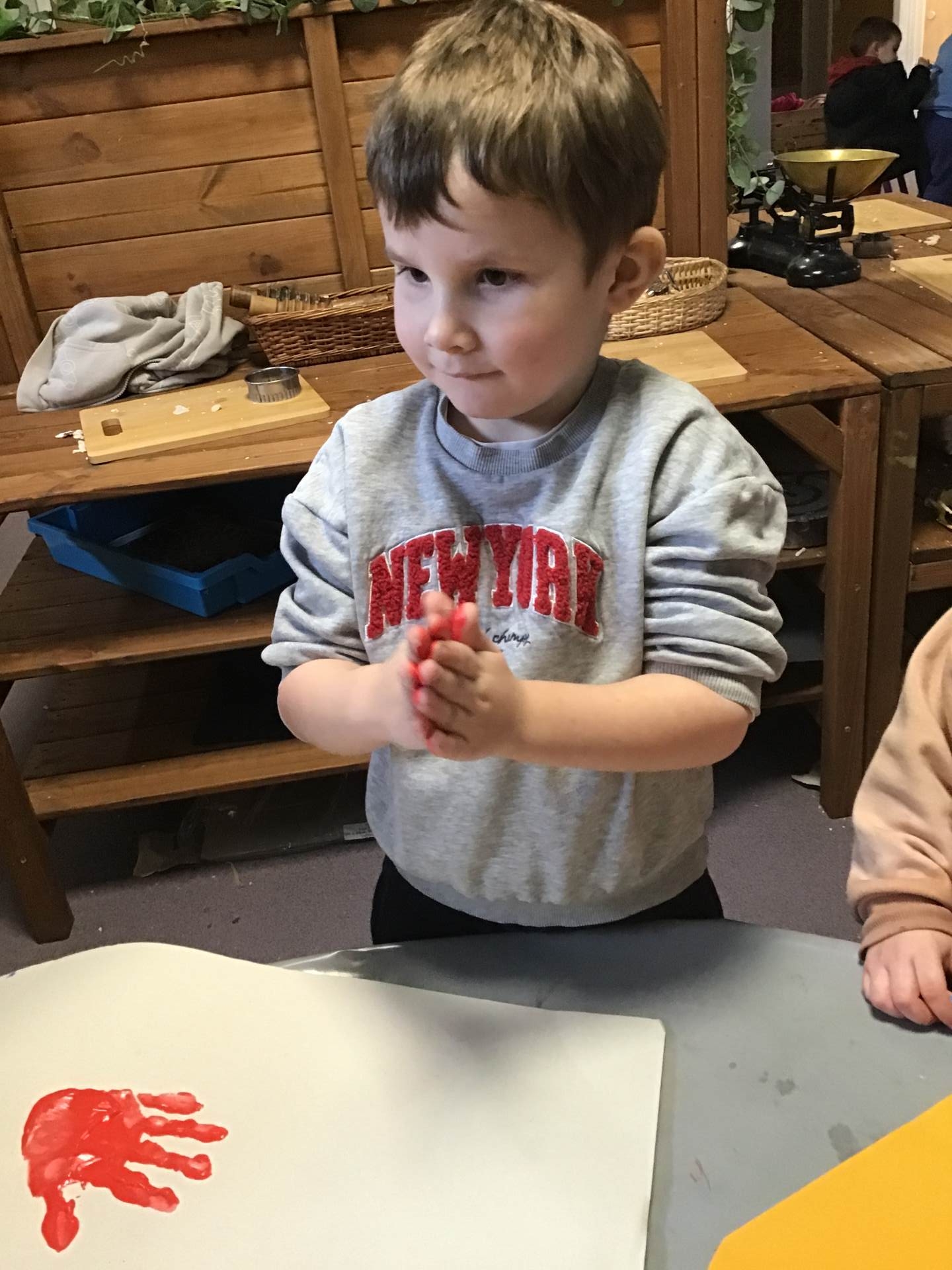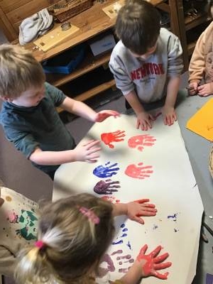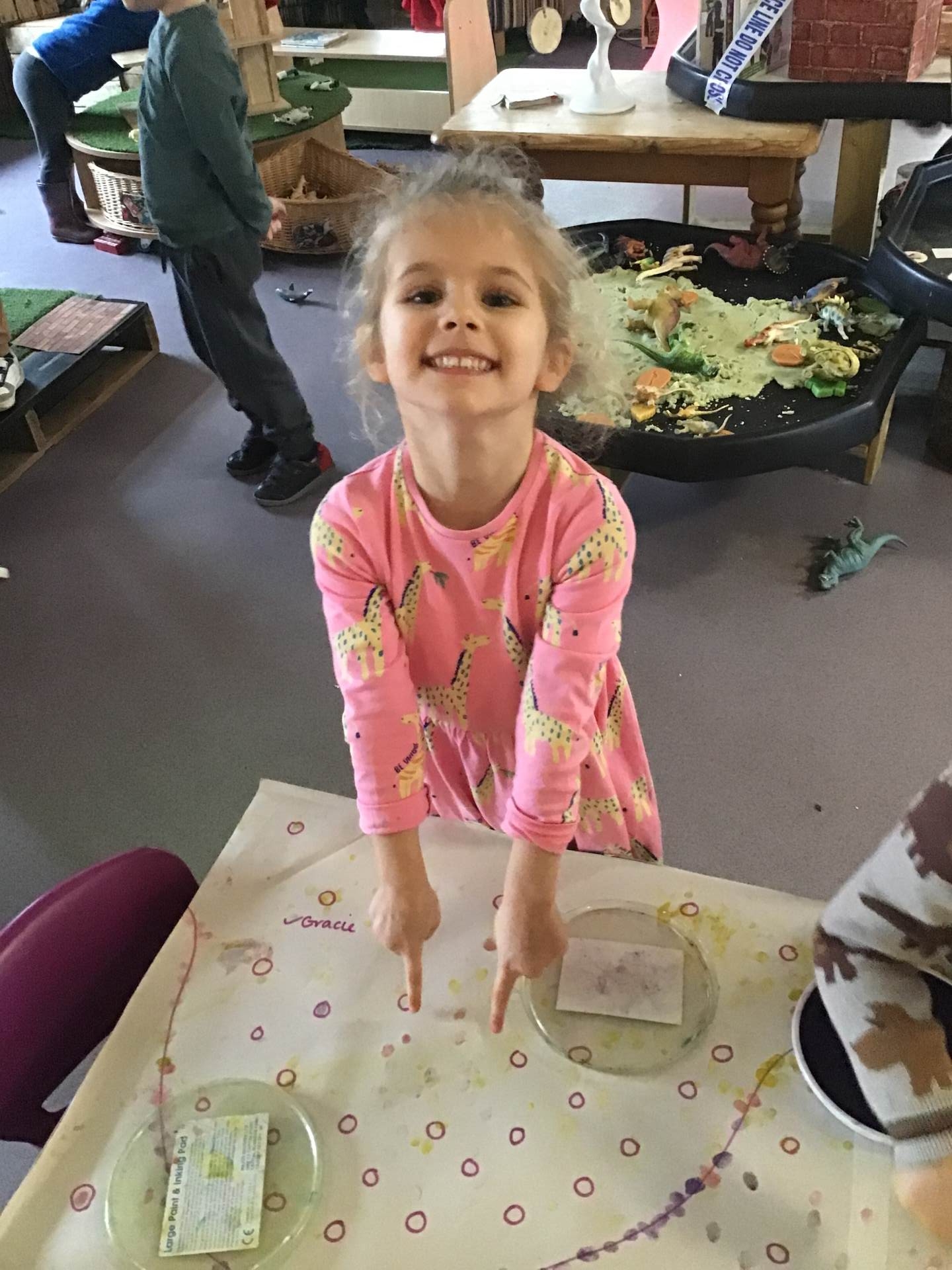 Meanwhile, in the construction zone, our builders have been hard at work rebuilding the wall for Humpty Dumpty. As they work together to create a sturdy structure, they're also investigating the mystery of who pushed Humpty Dumpty off the wall. Using finger painting to create simple patterns, they're refining their understanding of pattern creation and developing their accuracy skills.