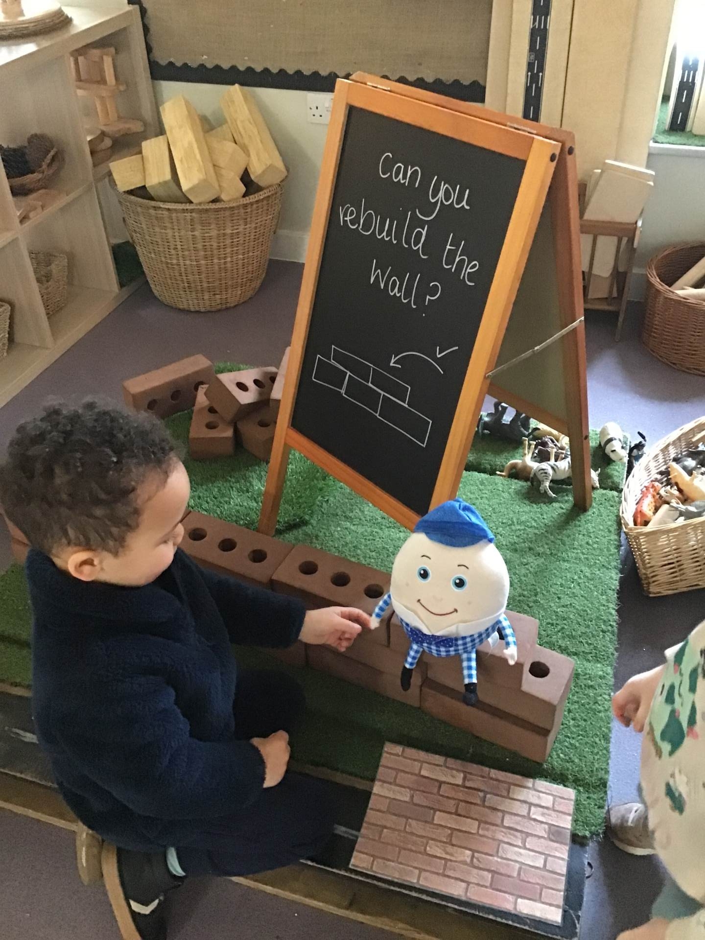- Making a simple pattern using paint, markers, or crayons and experimenting with different colors and shapes?Reading "Humpty Dumpty After the Fall" together and discussing ways to overcome obstacles and challenges.