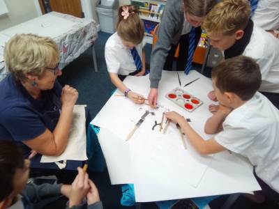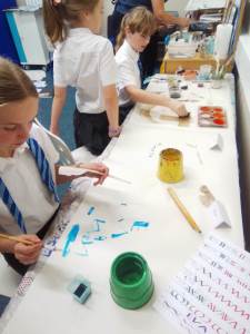 As part of their book illustration project, the Year 6 children had a visit from Calligrapher Jan Turner during this week's Friday Focus. They experienced everything, from matching the correct writing tool to the correct lettering (who knew there were so many!?!) , to writing with feathers dipped in ink! We did wonder if we could get away with using a very wide block tool to write our Sats next year and if it would speed things up a little! The children all had wonderful fun and learned a host of new skills.